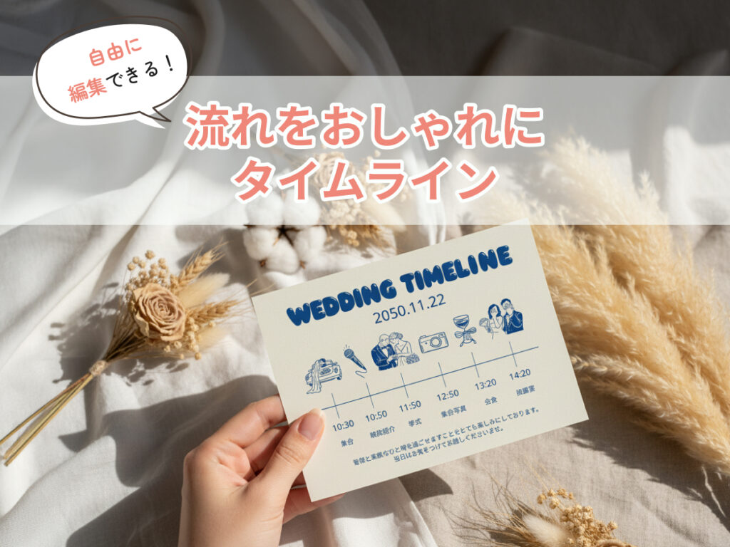 結婚式当日の流れをゲストにわかりやすく伝える「タイムライン」。当日の流れがひと目でわかるため、ゲストにも親切なアイテムとして取り入れるカップルが増えています。とはいえ、タイムラインを1からデザインするのは意外と大変。スケジュールを整理したり、アイコンを配置したりと、デザイン作業に時間がかかってしまいます。